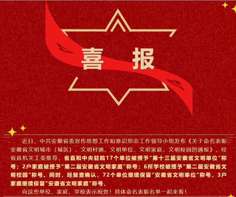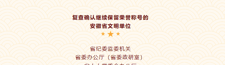 近日,中共安徽省委宣传思想工作和意识形态工作领导小组发布《关于命名表彰安徽省文明城市(城区)、文明村镇、文明单位、文明家庭、文明校园的通报》,安徽大剧院蝉联“安徽省文明单位”荣誉称号,这是安徽大剧院连续十届获得该荣誉。(安徽大剧院供稿)