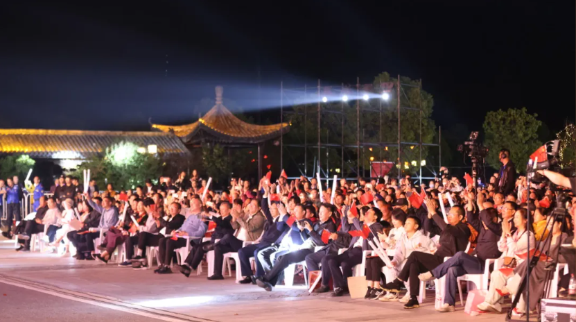 国庆假期首日,寿县古城处处洋溢着节日的气氛,处处红旗招展,游客络绎不绝。夜幕降临,伴随着庄严雄伟的《红旗颂》,演出正式拉开序幕。