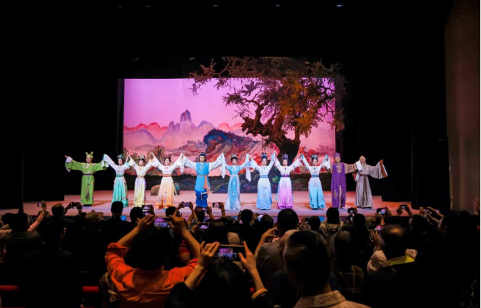 谢幕时更是高潮迭起,“安可”声不断,两位主演返场表演“对花”,观众们意犹未尽,直到大幕落下才挥手离去。(来源:安徽省黄梅戏剧院微信公众号)