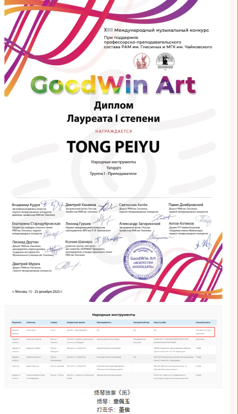 据了解,GoodWin Art是由古德温艺术协会与弗拉基米尔·库德里创意中心联合主办,并得到俄罗斯联邦文化部大力支持的国际艺术比赛。比赛旨在为全球音乐院校师生、职业音乐家及青少年艺术教育从业者提供一个展示才华的舞台,让音乐跨越国界,绽放无限魅力。评审团阵容强大,由俄罗斯荣誉艺术家、人民艺术家,以及格涅辛音乐学院和莫斯科柴可夫斯基国立音乐学院的教授、副教授和教师共同组成。(安徽乐团供稿)