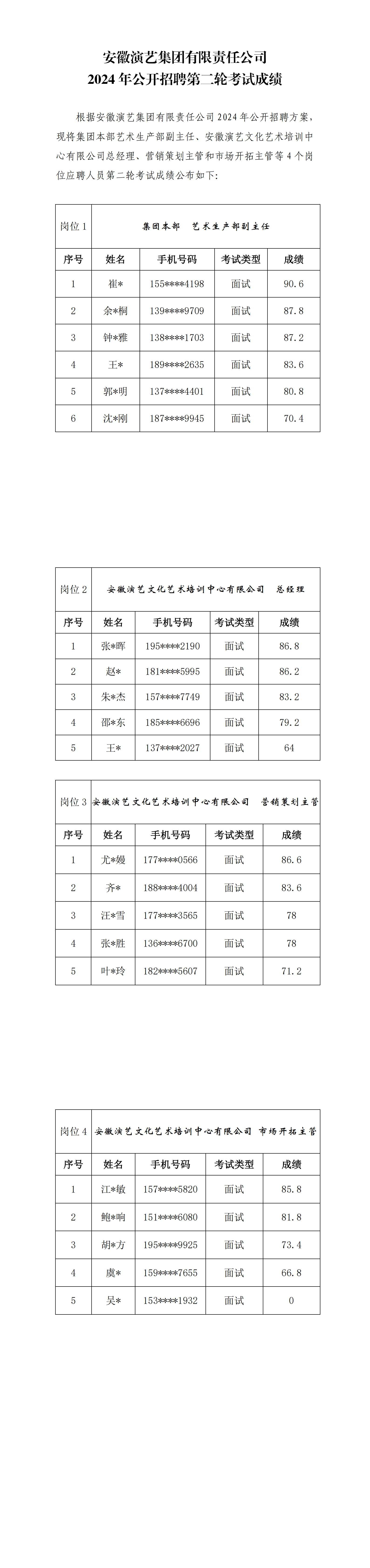 安徽演艺集团有限责任公司2024年公开招聘第二轮考试成绩公布
