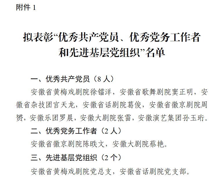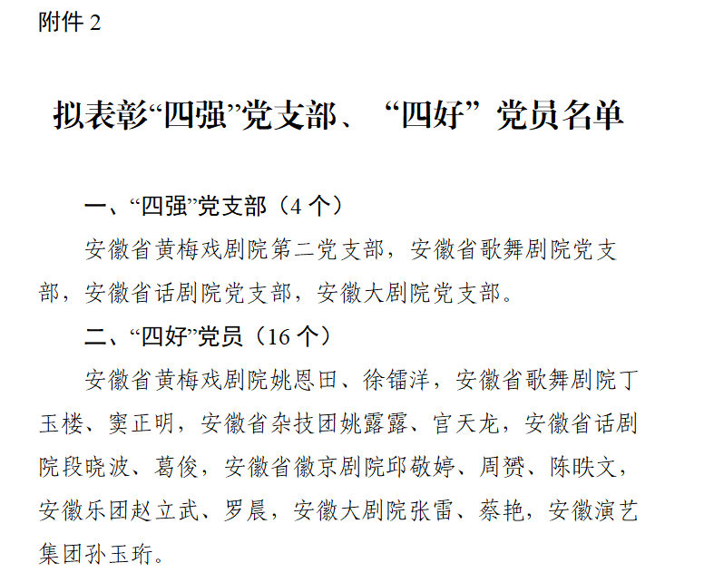 根据集团党委《关于开展“优秀共产党员、优秀党务工作者和先进基层党组织”评选活动的通知》《关于开展“四强”党支部评定、“四好”党员选树工作的方案》要求,经各基层党组织推荐申报、党委会议研究决定,拟表彰徐镭洋等8名同志为“优秀共产党员”,陈昳文等2名同志为“优秀党务工作者”,安徽省黄梅戏剧院党总支等2个党组织为“先进基层党组织”,安徽省黄梅戏剧院第二党支部等4个党支部为“四强”党支部,姚恩田等16名同志为“四好”党员。现予以公示(具体名单附后)。