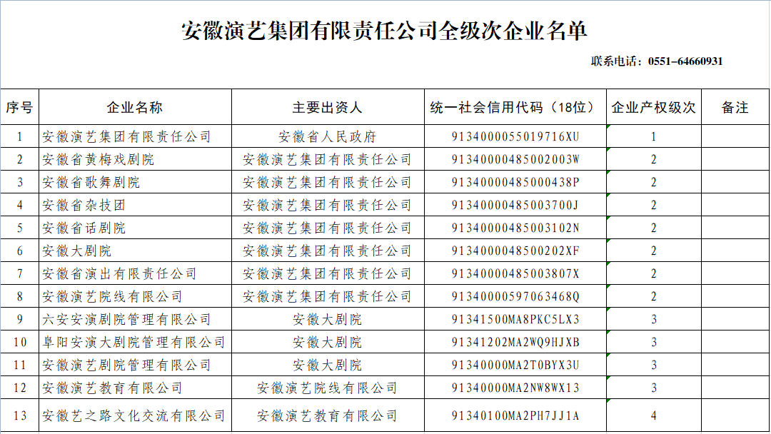 安徽演艺集团有限责任公司全级次企业名单