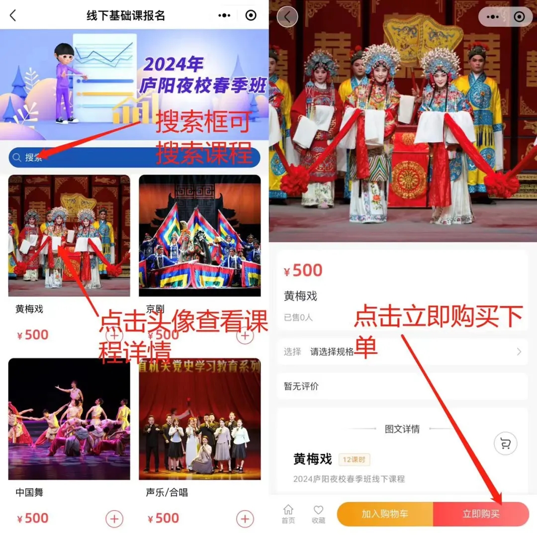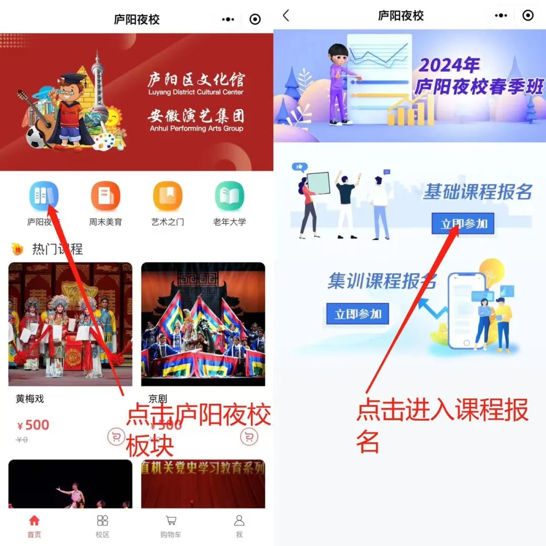 ①扫描上方二维码进入小程序,点击庐阳夜校板块。点击立即参加,进入课程列表。