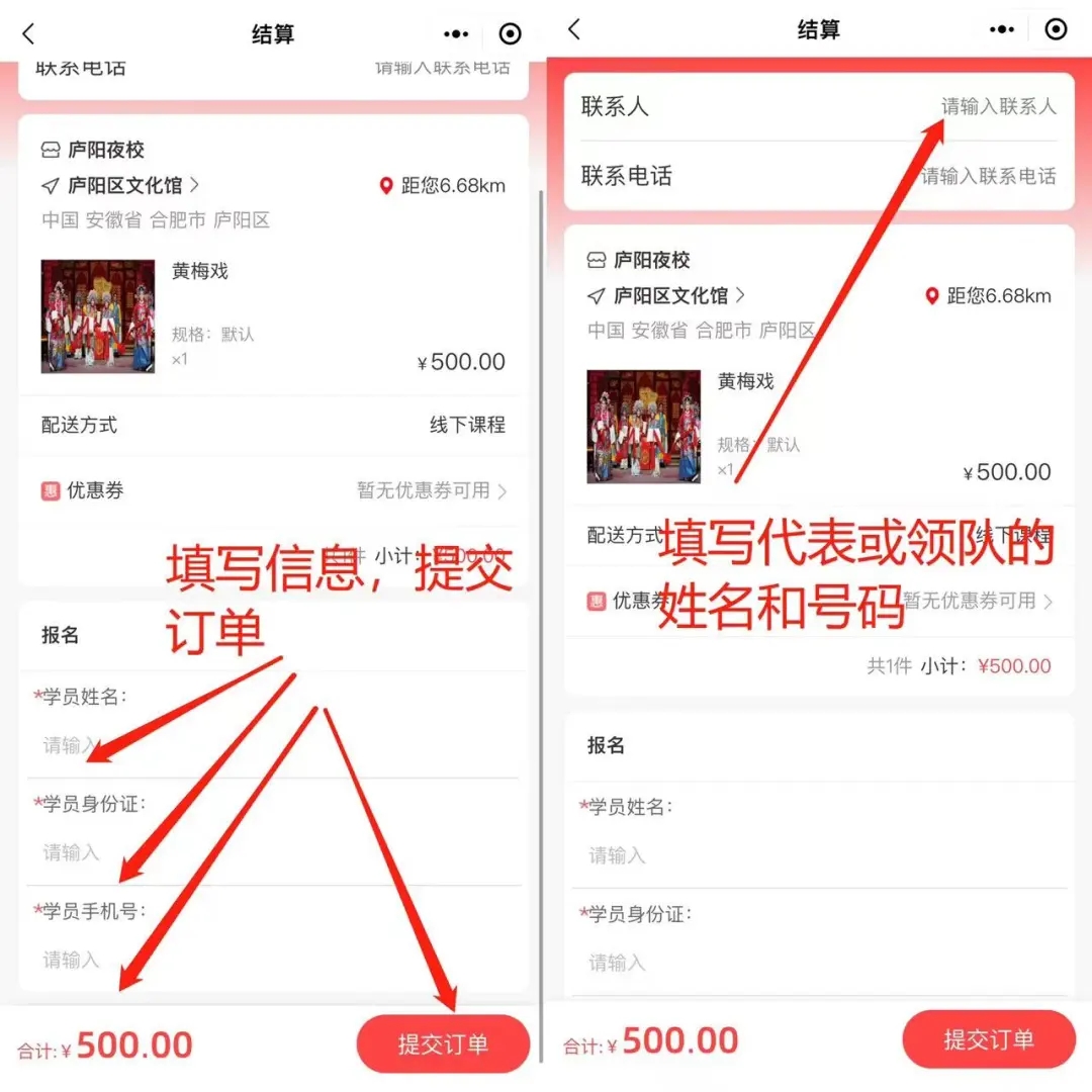 ③本次招生实行实名制,请填写学员姓名、学员身份证号、学员手机号,填写后提交订单并支付及报名成功。三人组团、五人及以上组团报名需要在订单提交界面顶部联系人及联系电话框,填写代表或领队的姓名及联系电话(需要填写统一的代表或领队姓名及联系电话)