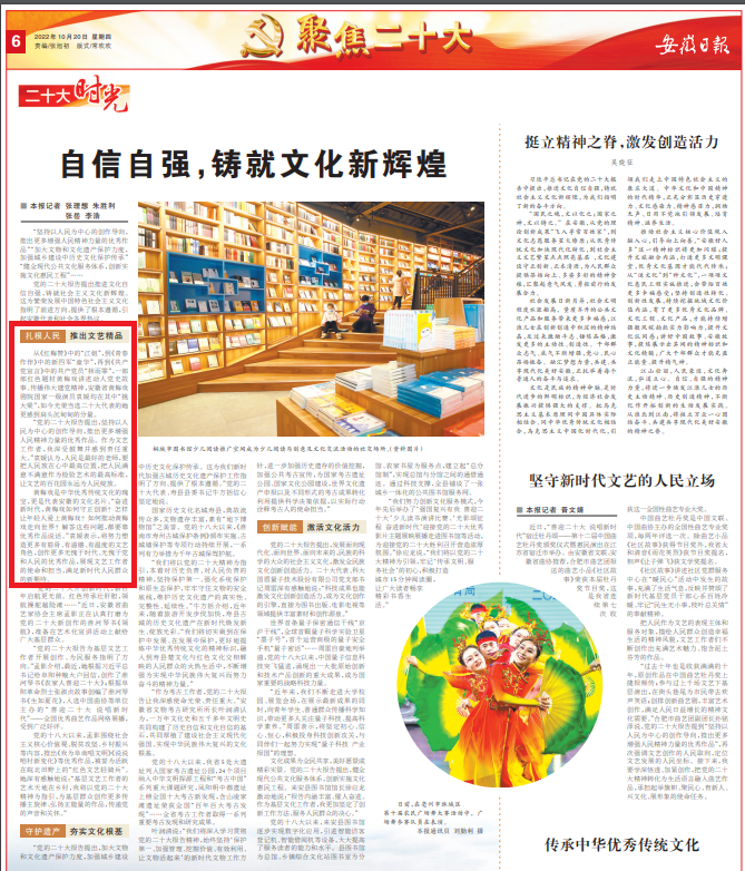 “坚持以人民为中心的创作导向,推出更多增强人民精神力量的优秀作品”“加大文物和文化遗产保护力度,加强城乡建设中历史文化保护传承”“健全现代公共文化服务体系,创新实施文化惠民工程”……党的二十大报告提出,推进文化自信自强,铸就社会主义文化新辉煌。这为繁荣发展中国特色社会主义文化指明了前进方向、提供了根本遵循。10月20日,《安徽日报》刊文《自信自强,铸就文化新辉煌》对党的二十大代表、安徽省黄梅戏剧院国家一级演员袁媛进行了采访,相关内容予以转载。