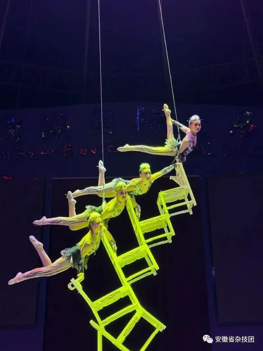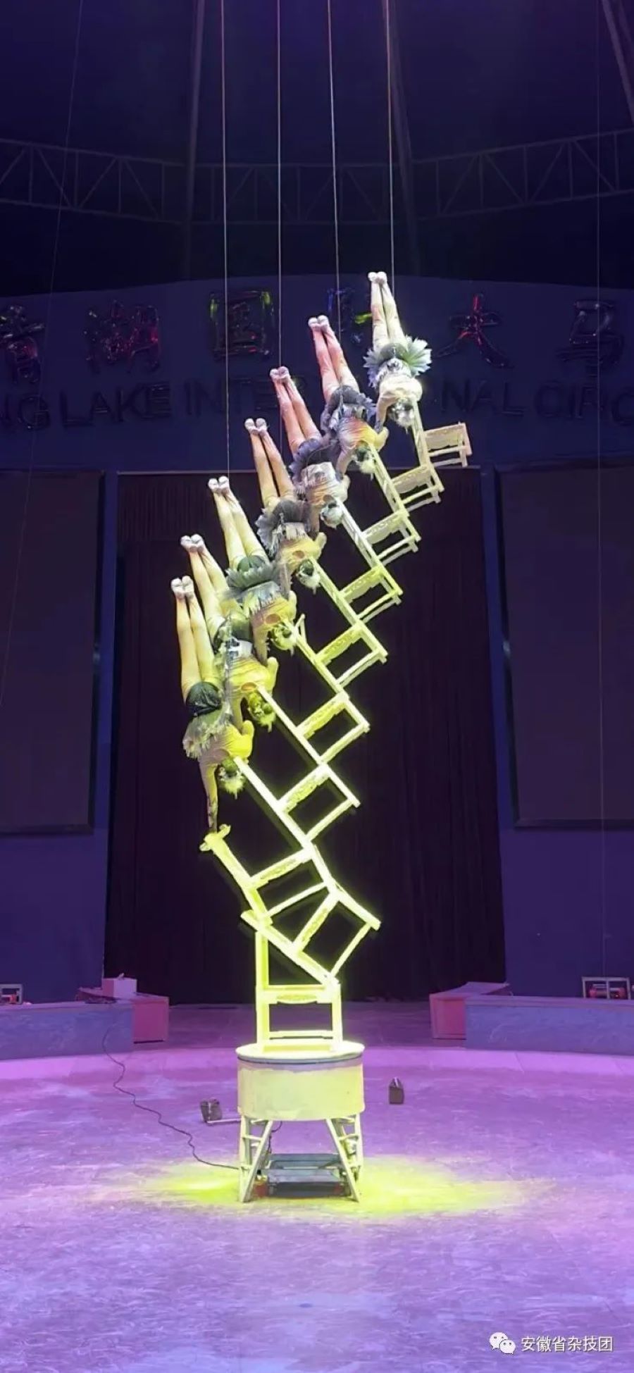 《天鹅之恋·漩叠椅》以天鹅为题,秉持传统杂技艺术高、难、险的特点,提升了杂技观赏性、艺术性,通过将“单手顶技巧”提升至“4人旱水单手倒立变旱水造型”“女子集体同起倒立漩叠椅360度旋转”,突出节目演出中技术延展的垂直性、连贯性,充分体现杂技女子节目对力量、技巧、配合及美感的追求。