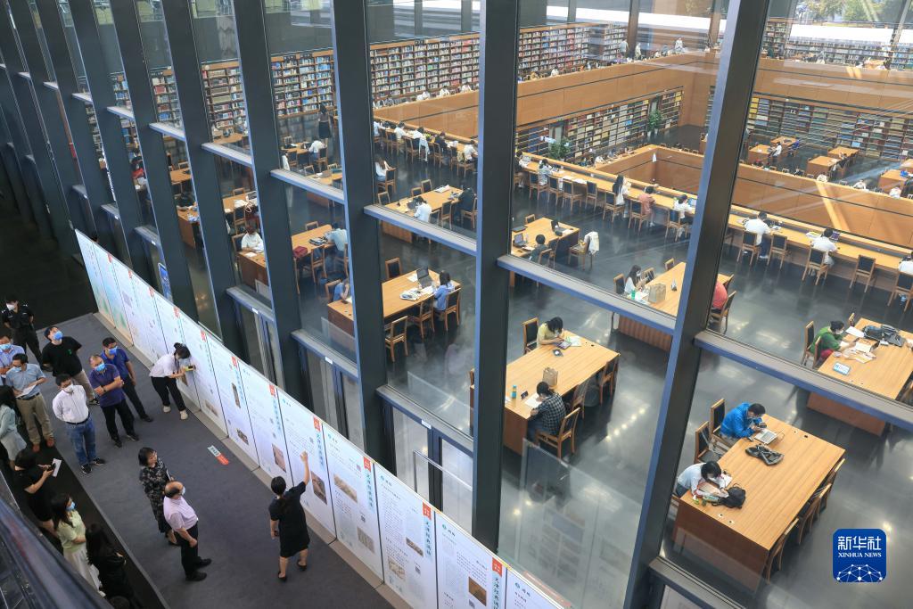 在北京国家图书馆,工作人员在介绍“经典,予生活以诗意——‘文津经典诵读’十周年主题展”(2022年9月7日摄)。新华社记者 殷刚 摄
