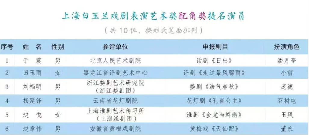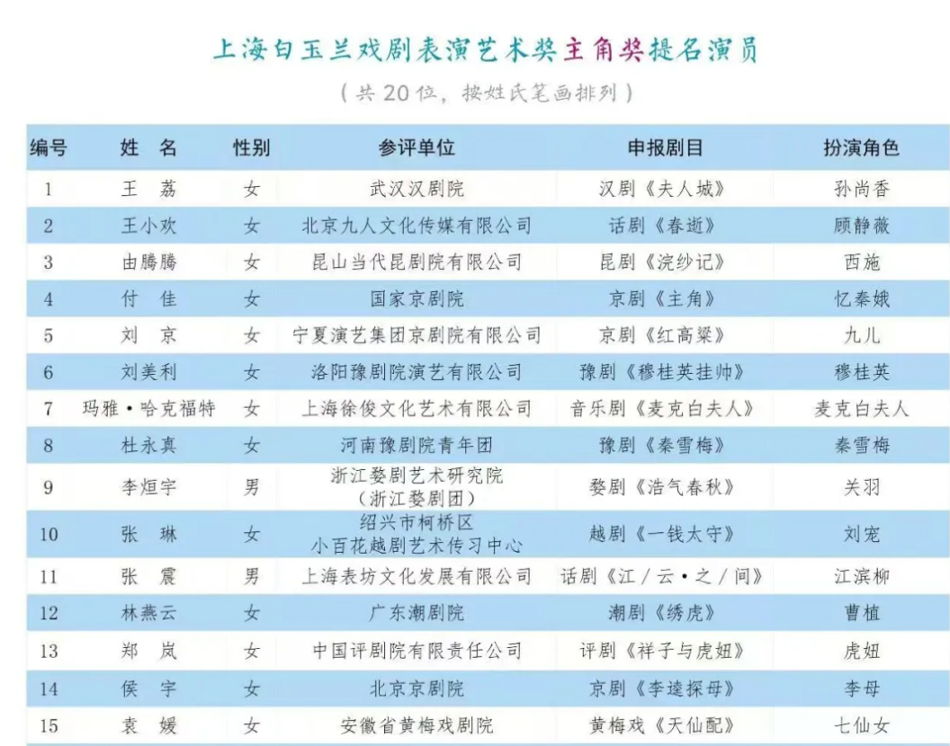 据悉,本届白玉兰奖提名奖演员共40人,其中主角奖20人、配角奖10人、新人主角奖5人、新人配角奖5人。2月27日晚,白玉兰奖颁奖晚会将在上海文化广场举行,现场将揭晓各奖项名单。