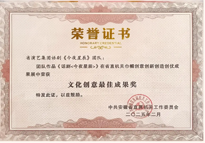安徽省话剧院《今夜星辰》剧组凭借其在舞台艺术创作上的独特视角、和精彩演绎,生动展现了女性在艺术创作中的创新精神,荣获省直机关巾帼创意创新创造创优成果文化创意最佳成果奖。