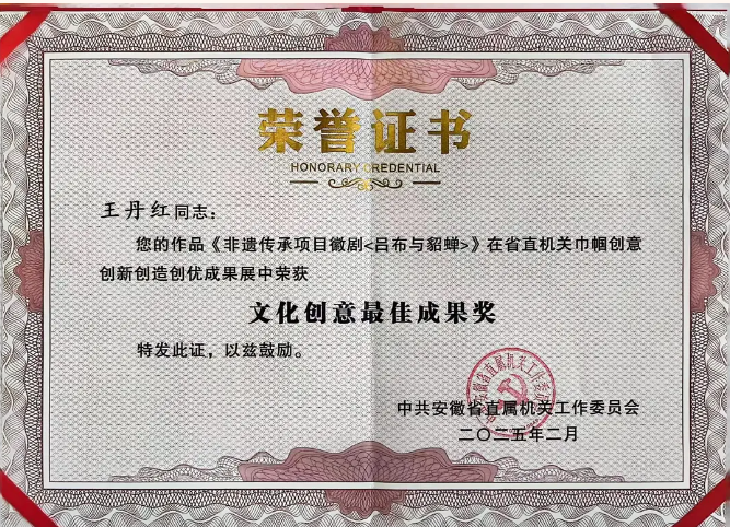 安徽省徽京剧院王丹红以其精湛的技艺、深厚的艺术造诣以及在传承与创新徽剧艺术方面的不懈努力,赢得了广泛赞誉,荣获省直机关巾帼创意创新创造创优成果个人最佳成果奖。