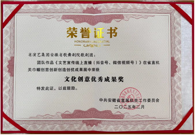 安徽省歌舞剧院抖音团队以新颖的形式和丰富的内容,创新性地传播歌舞艺术,有效提升了歌舞艺术的影响力和传播力,荣获省直机关巾帼创意创新创造创优成果团队优秀成果奖。