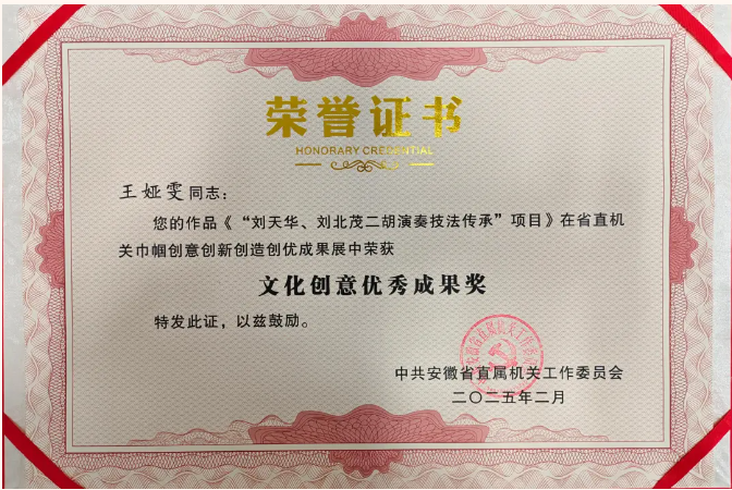 安徽乐团王娅雯不断探索创新,用灵动的音符和深情的演奏诠释音乐的魅力,荣获省直机关巾帼创意创新创造创优成果个人优秀成果奖。